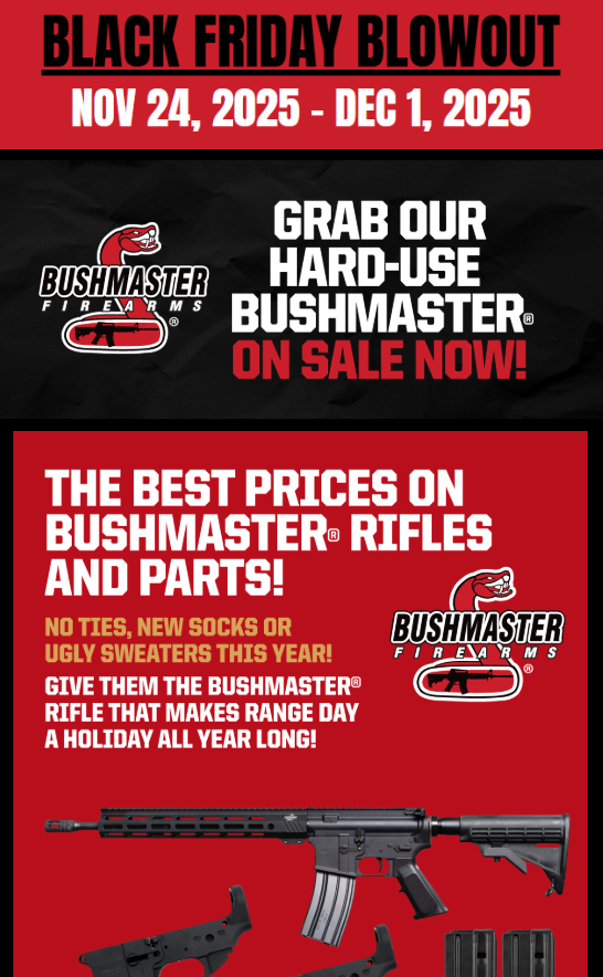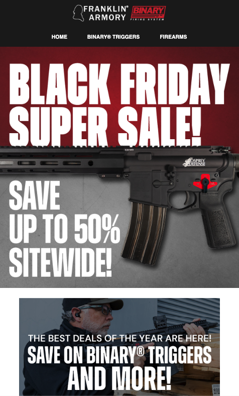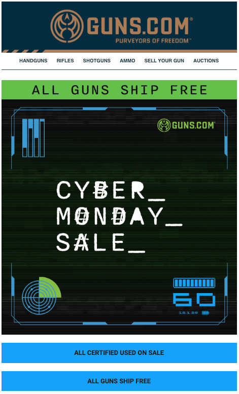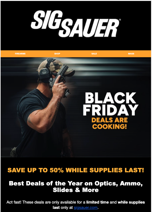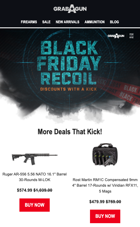 This Black Friday, Guns.com sent out several email blasts, including one warning viewers to “act fast!” before products sold out.
