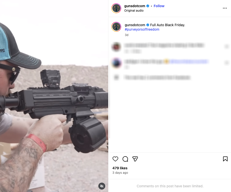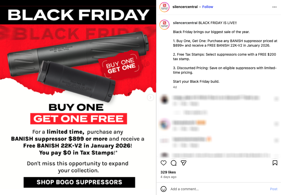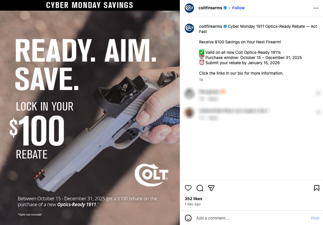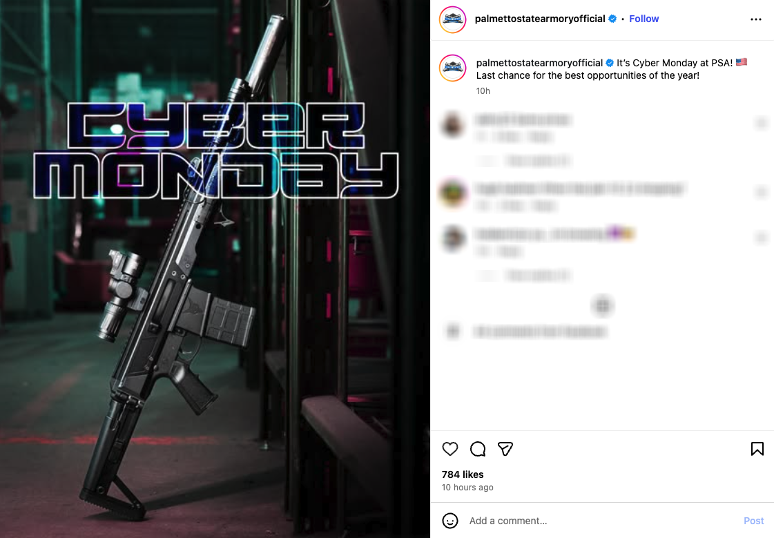 Along with email blasts, gun companies also took to social media to announce steep Black Friday and Cyber Monday discounts on firearms, ammunition, accessories, and merchandise. A few examples are shown below.