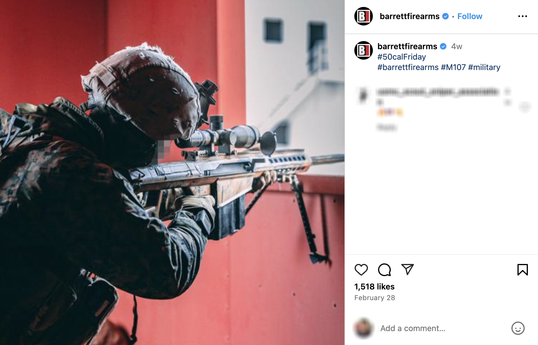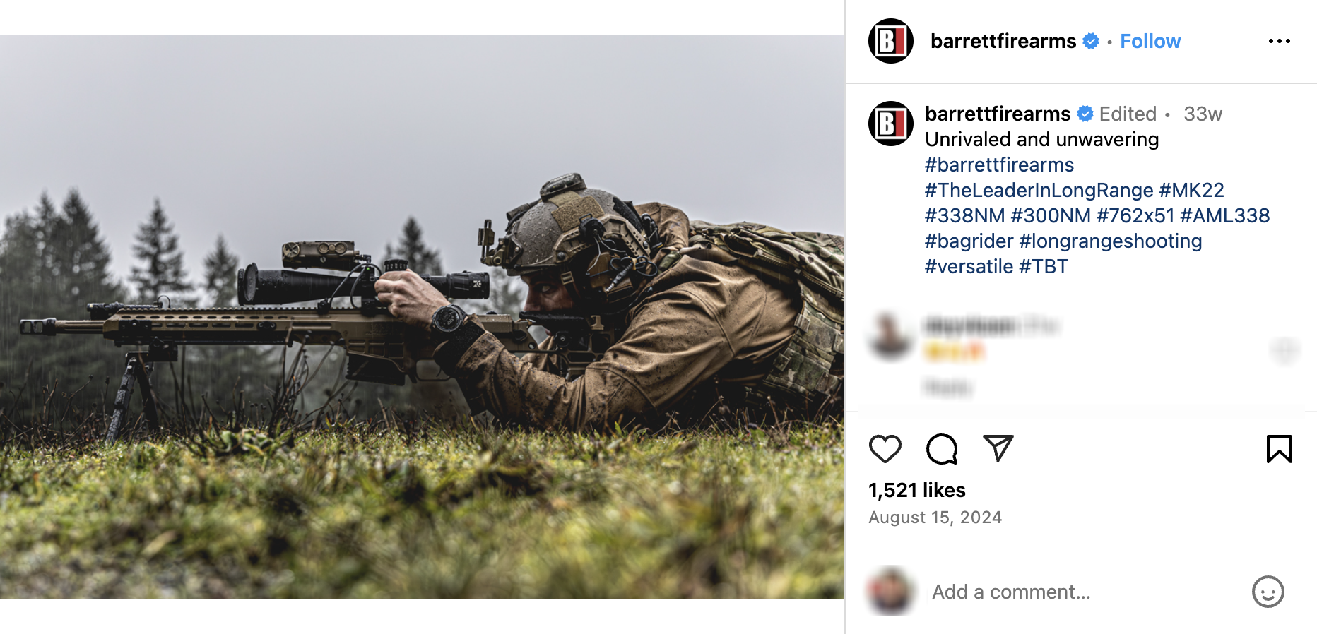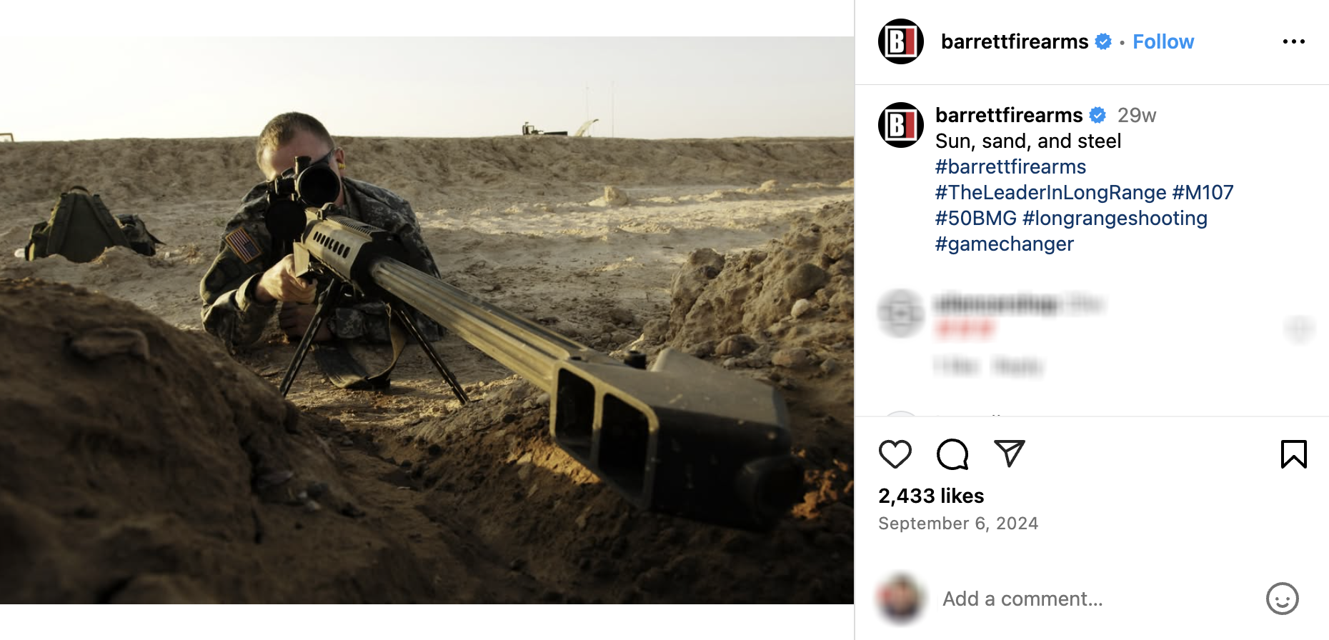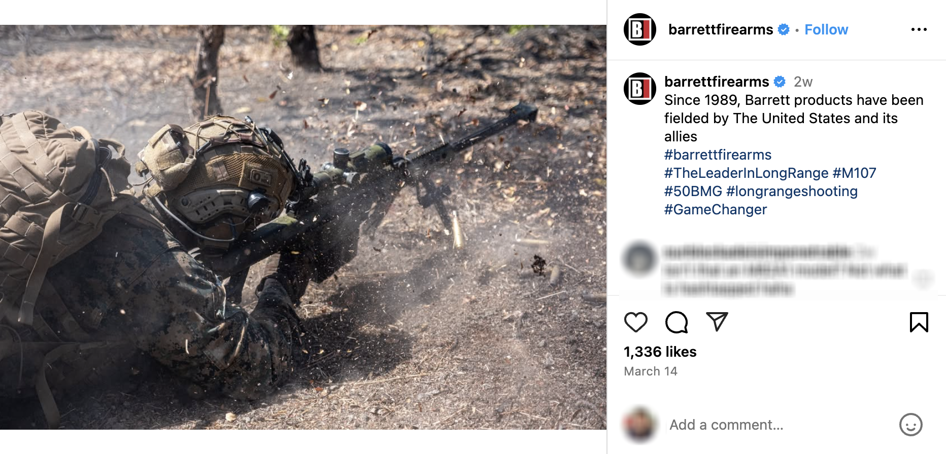 Despite the fact that Barrett sniper rifles are powerful enough to down helicopters, disable vehicle engines, and penetrate armor at great distances, Barrett aggressively markets the same guns to civilians as long-range shooting instruments capable of hitting targets over a mile away. The company’s ads and social media posts often depict Barrett rifles in the hands of soldiers and special operators as a way to legitimize them for commercial sales.
