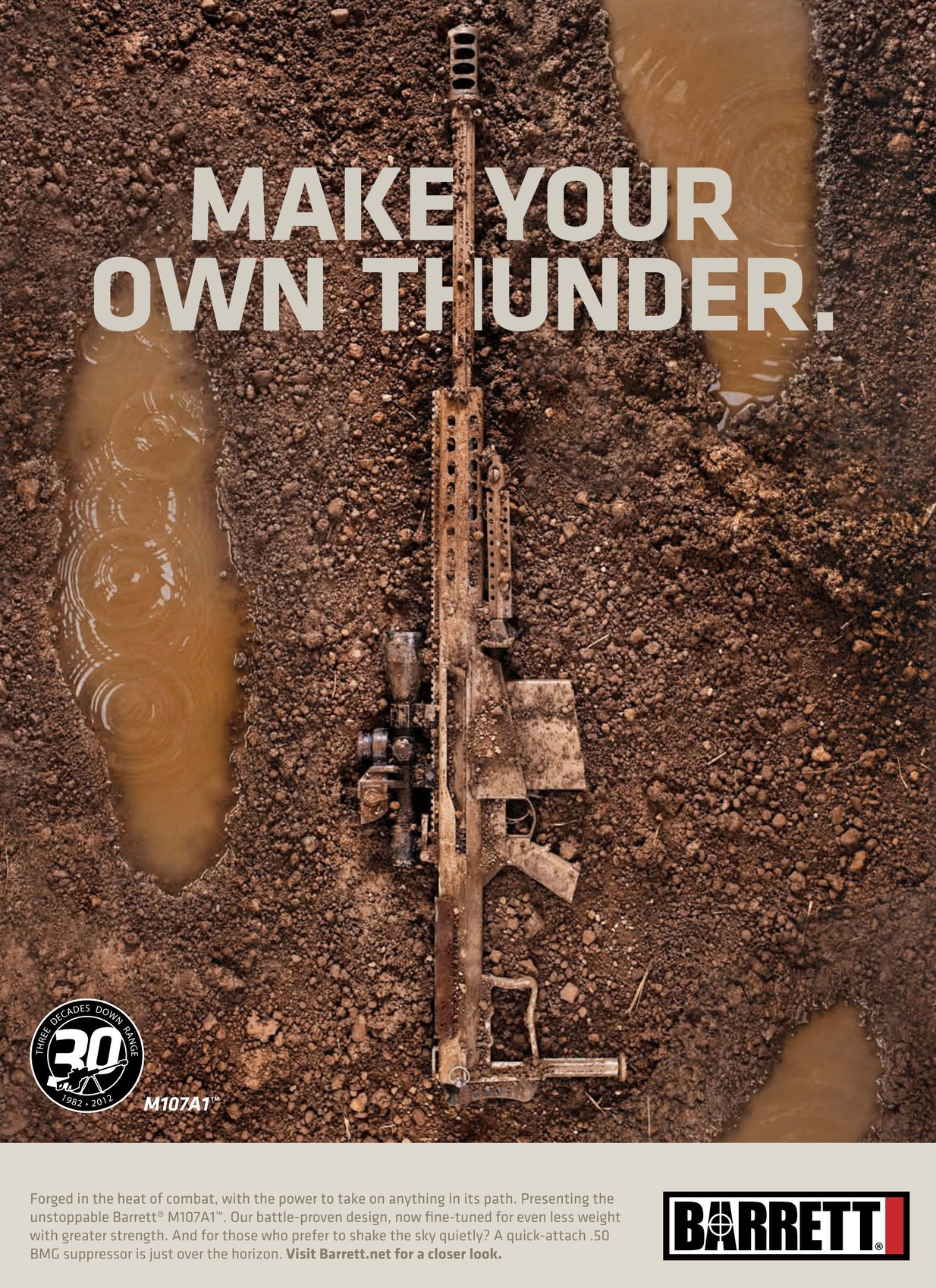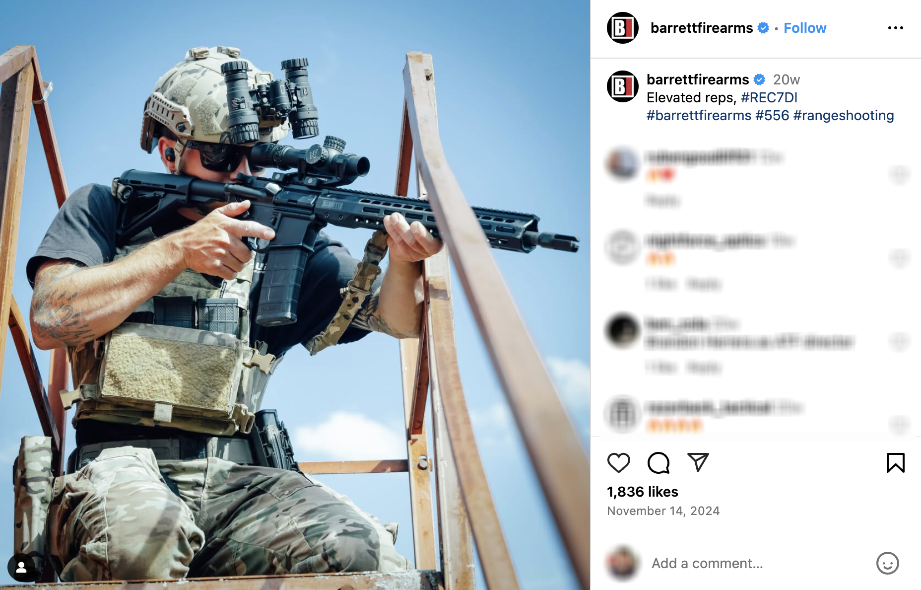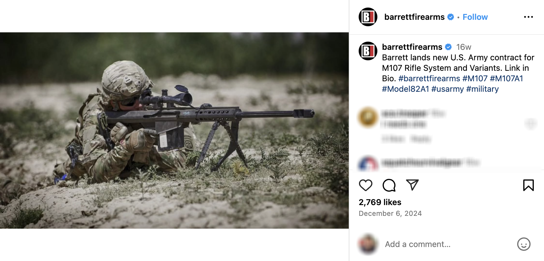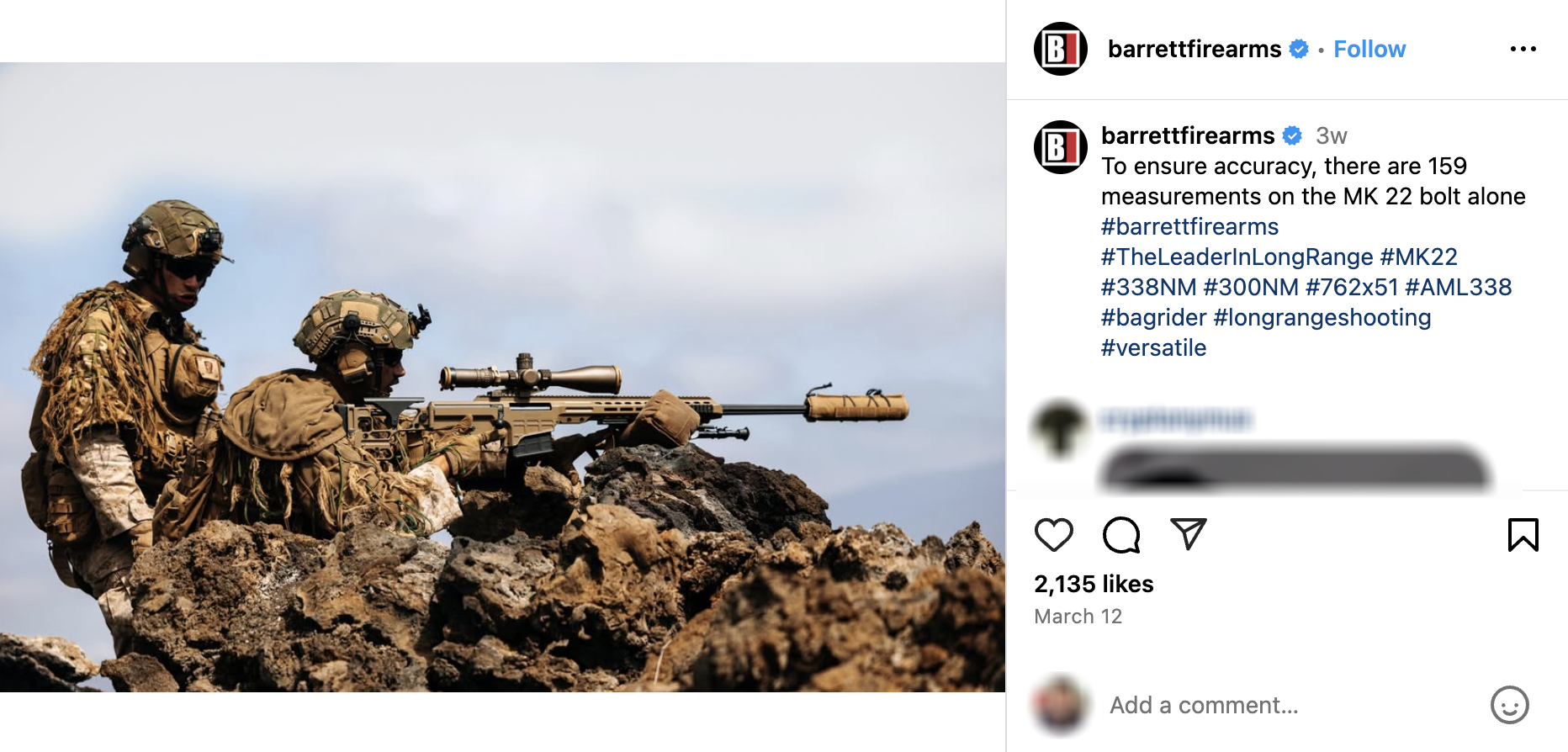 Despite the fact that Barrett sniper rifles are powerful enough to down helicopters, disable vehicle engines, and penetrate armor at great distances, Barrett aggressively markets the same guns to civilians as long-range shooting instruments capable of hitting targets over a mile away. The company’s ads and social media posts often depict Barrett rifles in the hands of soldiers and special operators as a way to legitimize them for commercial sales.