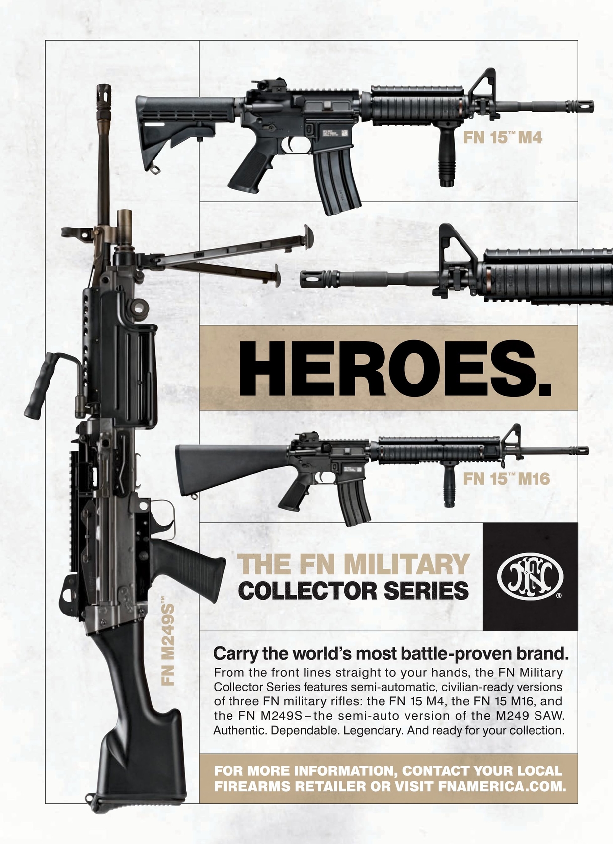Ads for the Military Collector series showcase FN’s “legendary” and “battle-proven” M4, M16, and M249S on their own and in the hands of soldiers.