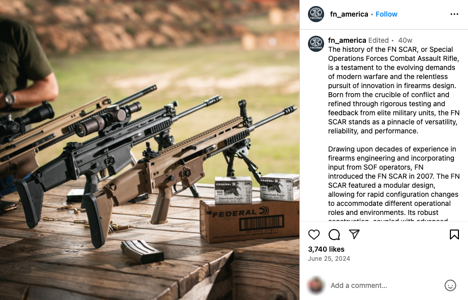 Like Colt, FN has parlayed its success with military contracts into civilian sales. FN first began selling the SCAR to civilians in 2008.17The Tactical Wire, “Civilian-Legal FN SCAR 16S Delivered at End of 2008, All Gone,” January 8, 2009, https://web.archive.org/web/20111008112444/http://www.thetacticalwire.com/release.html?releaseID=139975. By March 2010, FN was advertising three SCAR models on its website as “civilian legal, semi-auto only versions” of USSOCOM’s “newest service rifles.”18FN, “SCAR™ Semi-auto,” March 9, 2010, https://web.archive.org/web/20100309083136/http://www.fnhusa.com/le/products/firearms/family.asp?fid=FNF054&gid=FNG006. Over the years, FN grew its commercial SCAR lineup to include 11 different models19FN America, “FN SCAR Rifle Series,” archived October 20, 2025, https://web.archive.org/web/20251020131503/https://fnamerica.com/rifles/fn-scar-series/. before eventually discontinuing them in the fall of 2025.20FN America, “No more rumors,” X, October 26, 2025, https://x.com/FN_America/status/1978852255458549875.