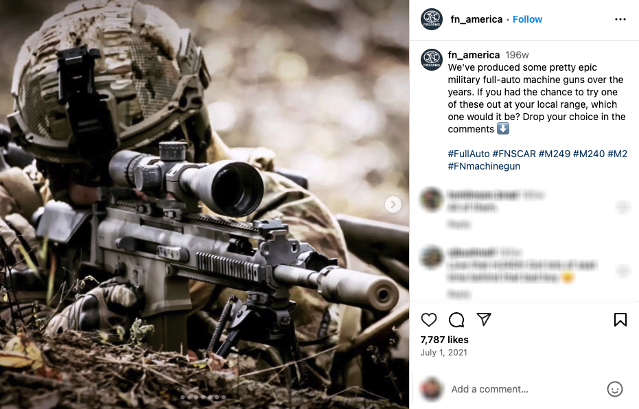 According to USAspending, FN has received at least $1.5 billion in DoD contracts since 2003.13See USAspending, FN America, accessed August 12, 2025, https://www.usaspending.gov/search/?hash=a77a8492aa52476063caf84b59773454; and USAspending, FN Herstal, accessed August 12, 2025, https://www.usaspending.gov/search/?hash=137d56b1c427c35e23ad22a9f7f44938. Note: Redundant FN listings were removed to obtain this contract total. In 2020, FN received a DoD contract worth up to $119 million to supply the U.S. Army with M4 and M4A1 rifles.14FN America, “FN Awarded U.S. Army Contract for M4 and M4A1 Carbines,” February 20, 2020, https://fnamerica.com/press-releases/fn-awarded-u-s-army-contract-for-m4-and-m4a1-carbines/. That same year, the company was awarded a $78.7 million contract to supply the U.S. Army with M249 Squad Automatic Weapons (SAWs) — belt-fed machine guns that the company first began producing for the U.S. military in the 1980s.15FN America, “FN Awarded U.S. Army Contract for M249 SAW,” September 24, 2020, https://fnamerica.com/press-releases/fn-awarded-u-s-army-contract-for-m249-saw/. And in 2022, FN was awarded a $50 million DoD contract to supply the U.S. Army with M240L machine guns and titanium receivers.16FN America, “FN Awarded U.S. Army Contract for M240L Medium Machine Guns and Titanium Receivers,” February 8, 2022, https://fnamerica.com/press-releases/fn-awarded-u-s-army-contract-for-m240l-medium-machine-guns-and-titanium-receivers/.