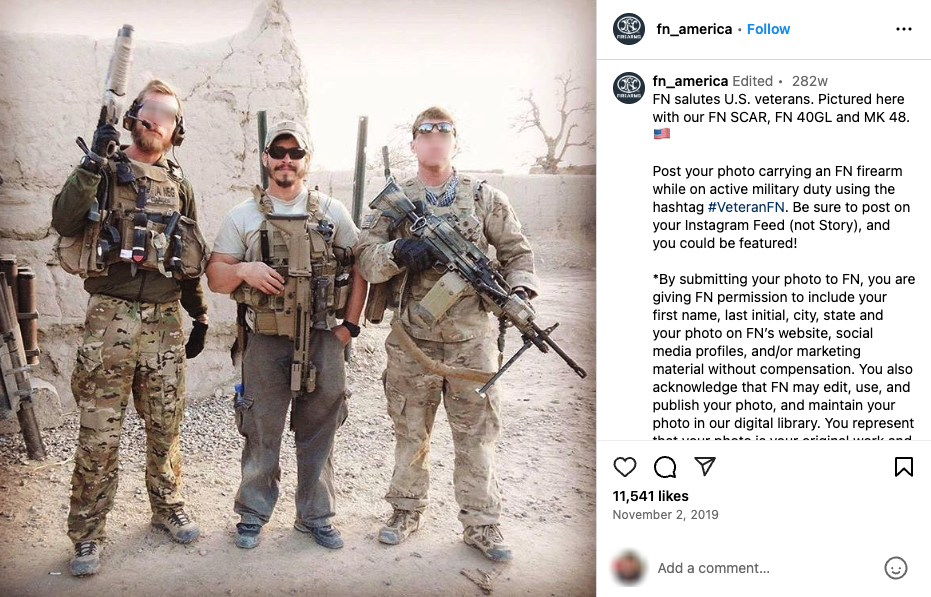 In 2015, FN launched its “Military Collector” series featuring “commercial variants of FN’s most iconic and historic military designs.” At the time, FN America’s president and CEO, Mark Cherpes, said, “We’re excited to bring these semi-automatic versions of the world’s most iconic products to America’s gun owners.”21FN America, “FN Introduces New Military Collector Series,” November 11, 2015, https://fnamerica.com/press-releases/pr-151111/. The series includes “replica” M16 and M4 rifles, and FN notes that the latter is “made to FN’s, and the U.S. military’s exacting specifications.”