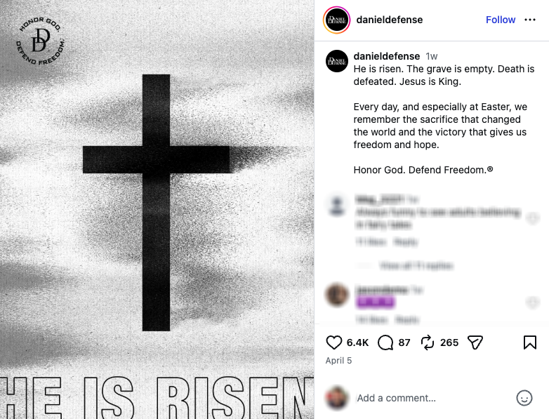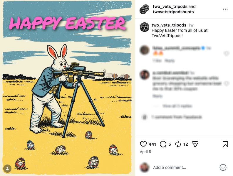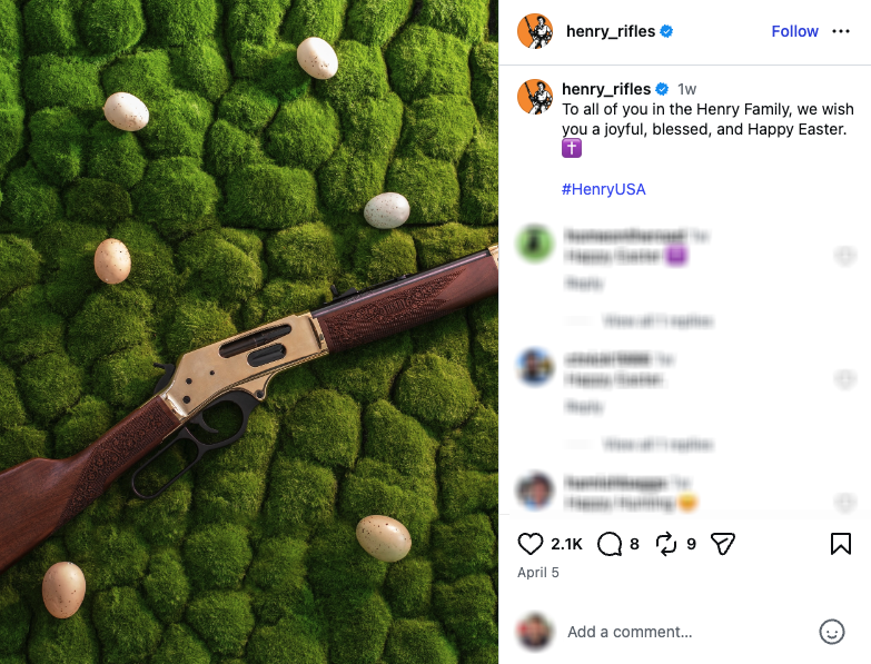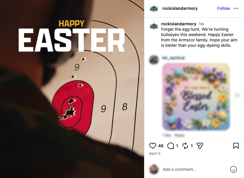For many Americans, Easter is not only a religious holiday, but also a time for family gatherings, often marked by traditions like Easter egg hunts, baskets, and time spent with loved ones. But like Valentine’s Day, the holiday has become another opportunity for gun makers to market firearms — including assault weapons, the guns used in the country’s deadliest mass shootings — ammunition, and silencers on social media, as illustrated by the examples below.
