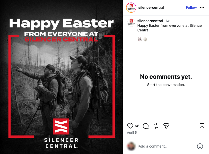 Several companies also used Easter to market silencers, or sound suppressors, on social media. For example, Rugged Suppressors posted an image of the Easter bunny armed with an MP5-style assault weapon with a silencer installed.